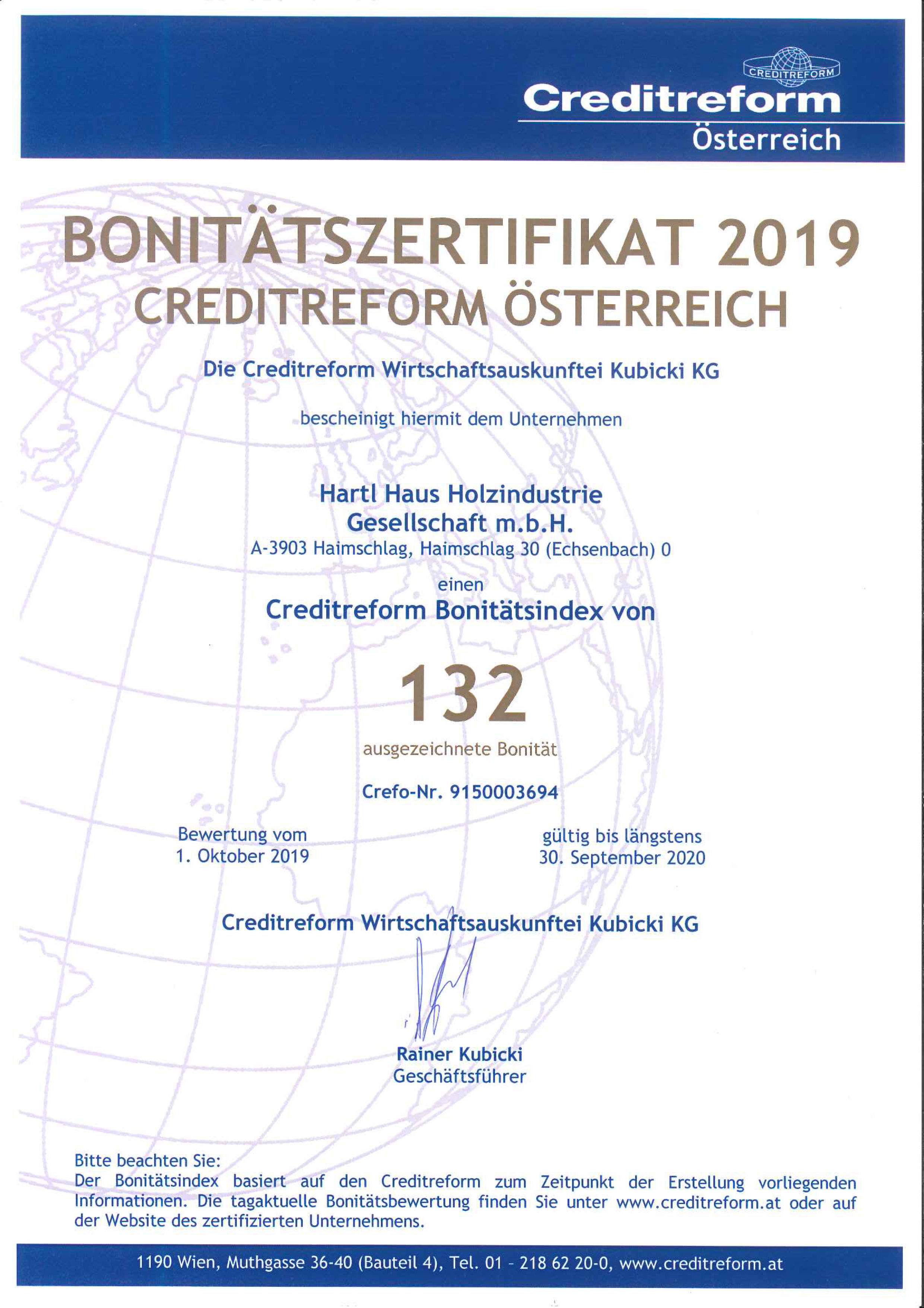 Bestnote für Bonität im Jahr 2019 bei HARTL HAUS