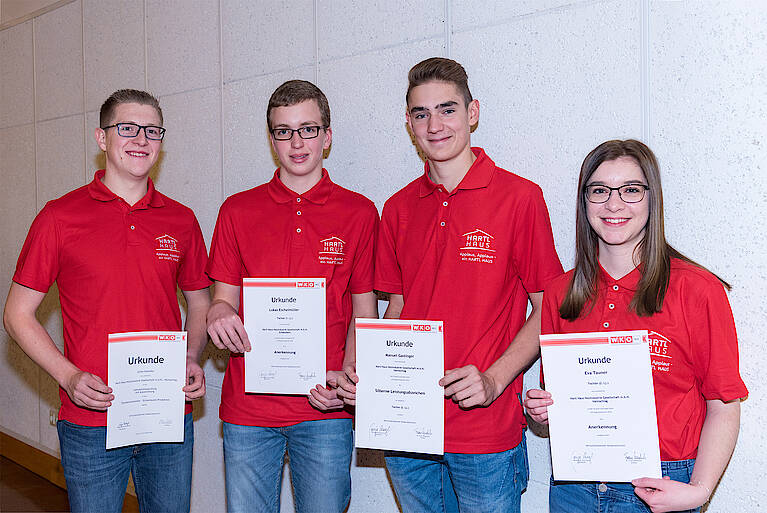 Text zu Bild 1: Vier HARTL HAUS Lehrlinge wurden bei der Ehrung der bezirksbesten Lehrlinge der Wirtschaftskammer NÖ ausgezeichnet. Julian Homolka wurde für seinen ausgezeichneten Lehrabschluss geehrt, Manuel Gastinger erhielt für seinen 2. Platz beim Landeslehrlingswettbewerb das Silberne Leistungsabzeichen der WKO und Lukas Eschelmüller und Eva Tauner wurden für die Teilnahme am Landeslehrlingswettbewerb geehrt.