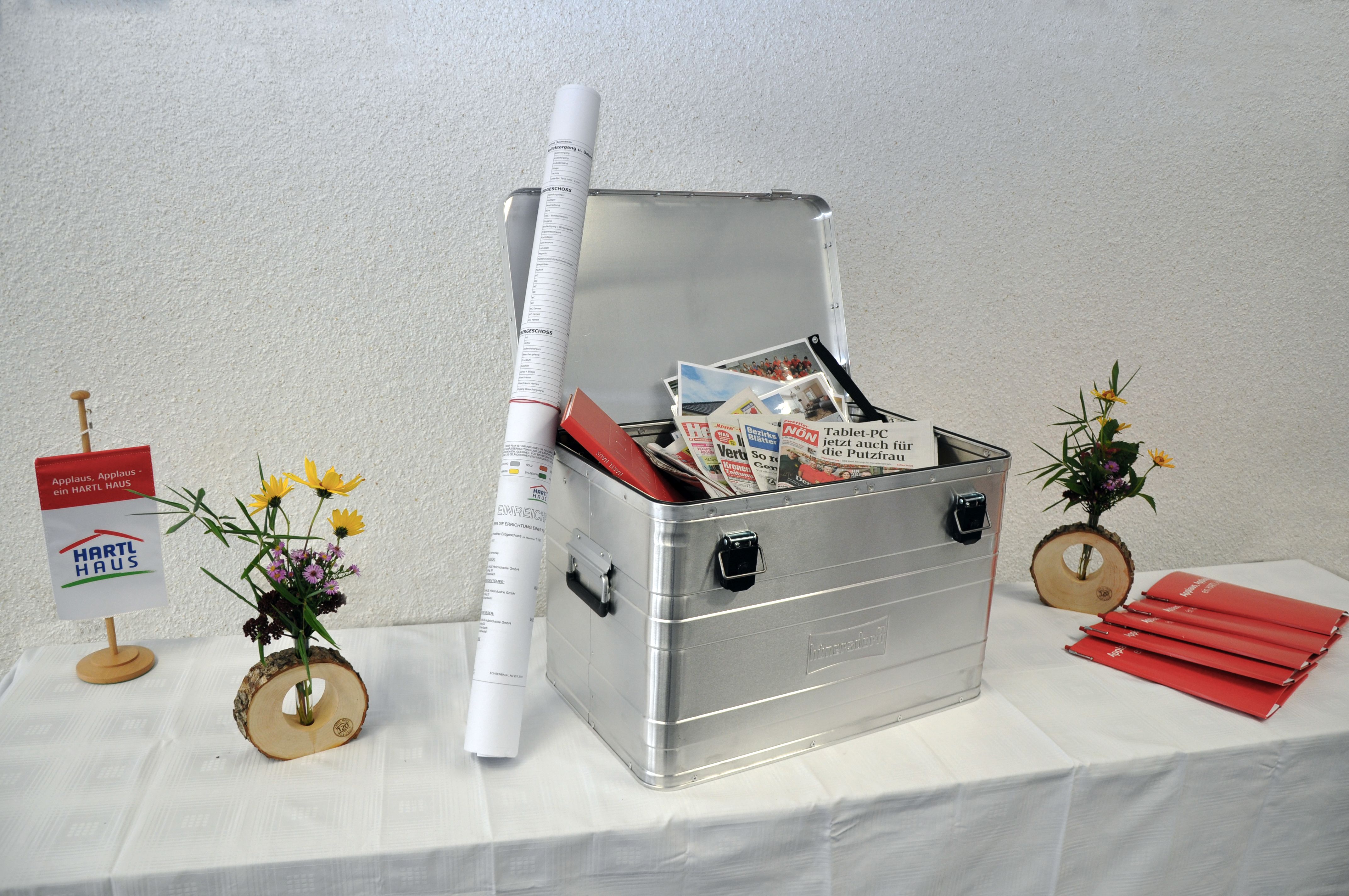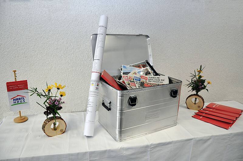 Anlässlich des Spatenstiches wurde auch eine Zeitkapsel mit Gegenständen gefüllt, die symbolisch für die Gegenwart und Vergangenheit von HARTL HAUS stehen. Diese Zeitkapsel wurde unter anderem mit den Planunterlagen des Neubaus, Luftbildaufnahmen des Werkgeländes, Mitarbeiterfotos, dem aktuellen Werbematerialien, der 120-Jahr-Firmenchronik, einem Werkstück der Tischler-Lehrlinge und aktuellen Tages- und Wochenzeitungen befüllt.