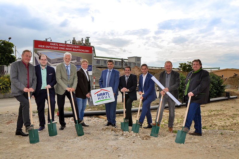 Text zu Bild: Rund 6,5 Millionen Euro investiert HARTL HAUS in den Neubau der Bautischlerei. Mit dem Spatenstich startet nun offiziell der Neubau des rund 5.300 m² großen Produktionsbereiches.