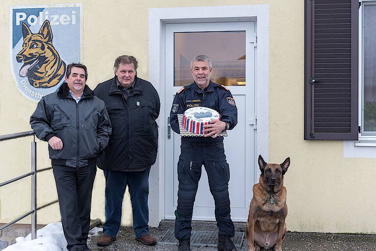 Anlässlich des zehnjährigen Jubiläums statteten Geschäftsführer Dir. Peter Suter und Ing. Andreas Nichtawitz der Diensthundestelle einen Besuch ab und überreichte als kleine süße Überraschung eine Geburtstagstorte.