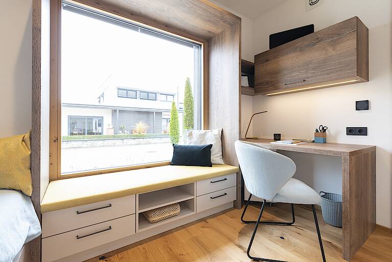 Dank der kompakten Grundrissplanung schafft das „Elegance 128 W“ Platz für drei Zimmer und einen großzügigen Wohnbereich. Die durchdachte Raumaufteilung gliedert den Bungalow in den geselligen Wohn- und Lebensbereich und in einen Ruhebereich mit drei Schlafzimmern und Familienbad. Für das Jugendzimmer hat sich HARTL HAUS mit einer gemütlichen Panoramafensterbank eine Besonderheit einfallen lassen.